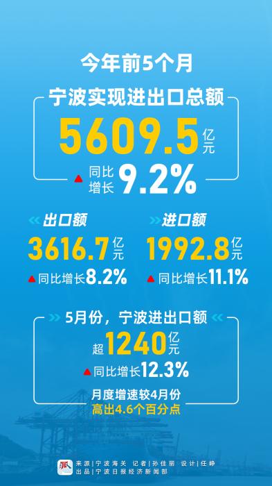 今年前5個(gè)月,寧波實(shí)現(xiàn)進(jìn)出口總額5609.5億元,同比增長9.2%。其中,出口額3616.7億元,同比增長8.2%;進(jìn)口額1992.8億元,同比增長11.1%。